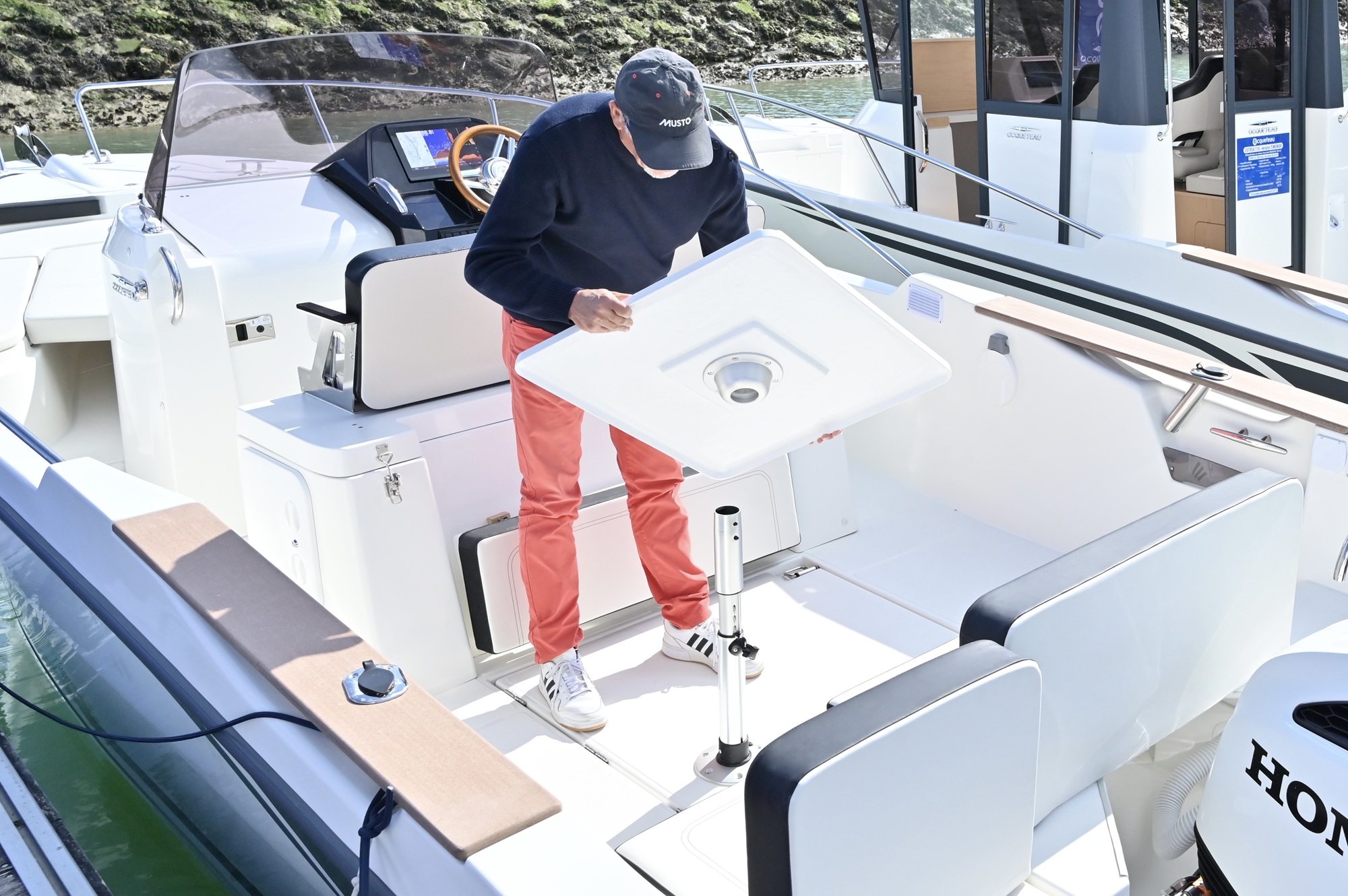 Avec la banquette compas tournée vers le cockpit, les deux banquettes latérales et la banquette arrière, 8 personnes peuvent s’installer autour de la double table de cockpit.
