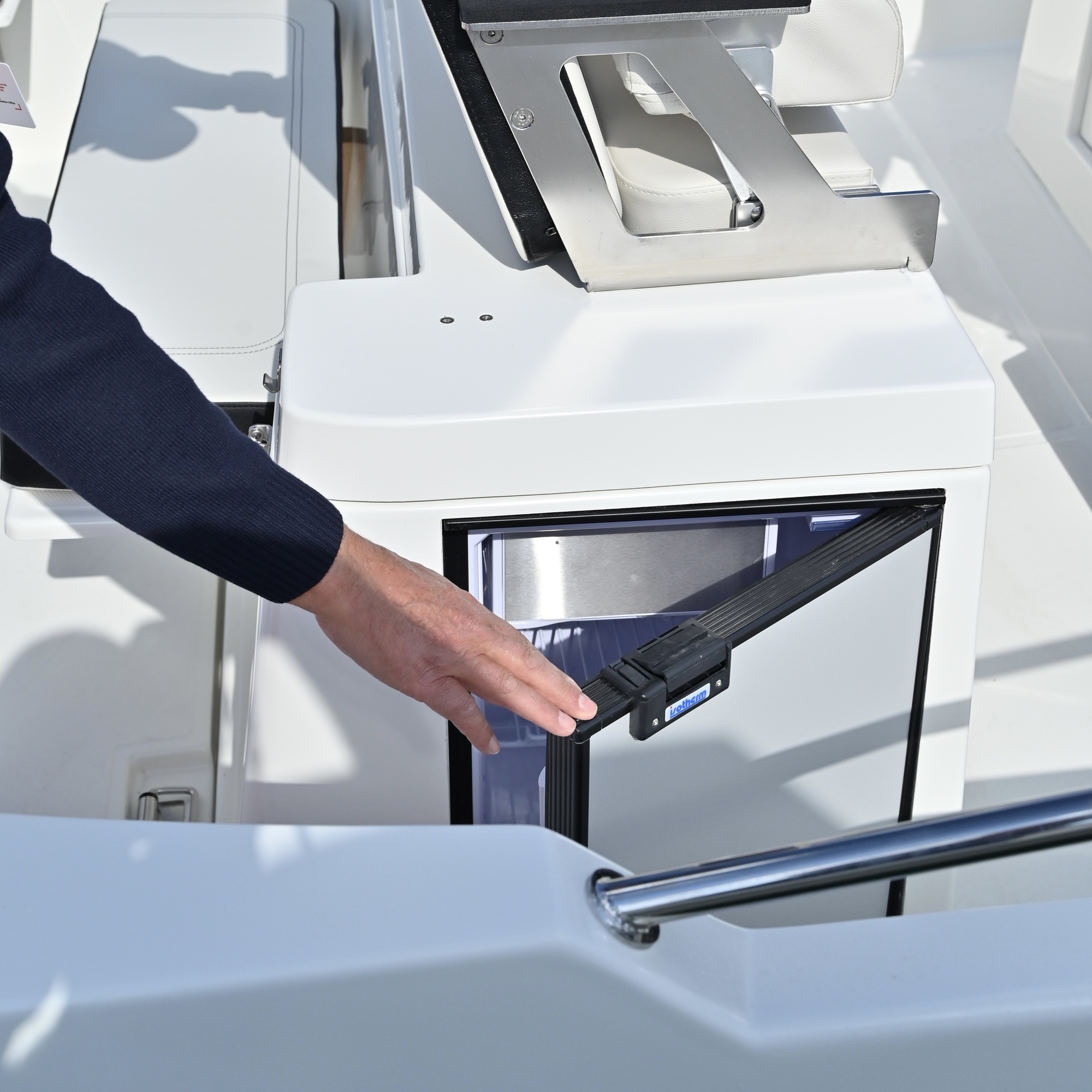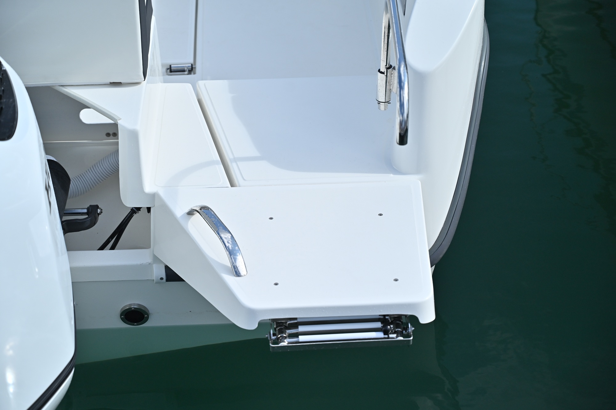 Siège réglable en hauteur coulissant et pivotant à 360° avec housse / Banquette arrière de cockpit avec dosseret inox / Coffre de cockpit avec fermeture / Echelle de bain / Plats bords en bois composites / Vérins capots de moteur et de cockpit /2 portes cannes inox / douchette de cockpit avec réservoir 50L / Doubles plages arrières avec échelle de bain encastrée